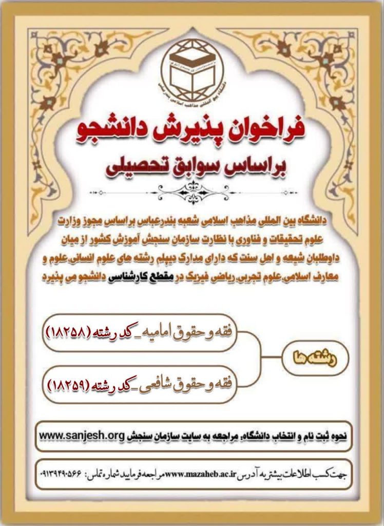 به گزارش پایگاه خبری میناب جنوب ،🔸دانشگاه بین المللی مذاهب اسلامی در مقطع کارشناسی پیوسته صرفاً بر اساس سوابق تحصیلی (معدل کتبی دیپلم) به صورت رایگان از میان خواهران و برادران واجد شرایط در رشته های فقه و حقوق امامیه و فقه وحقوق شافعی دانشجو می پذیرد.