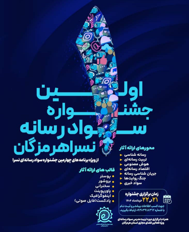 به گزارش پایگاه خبری میناب جنوب ، از ویژه برنامه های چهارمین جشنواره سواد رسانهای نسرا ، در امتداد مسیر تبیین و ارتقای آگاهی رسانهای، «نخستین جشنواره سواد رسانهای نسرا هرمزگان» با محورهای متنوعی همچون رسانه شناسی، تربیت رسانهای، هوش مصنوعی، اقتصاد رسانه، جریان شناسی رسانهای، جنگ روایتها و سوادکودک برگزار میشود.