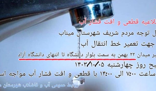 میناب - قابل توجه مردم شریف و ولایت مدار شهرستان میناب به جهت تعمیر خط انتقال آب فردا با برخی از مناطق شهر میناب با قطعی و افت فشار آب مواجه است.