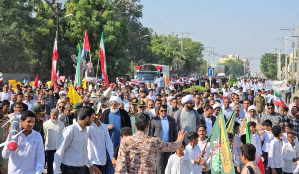 میناب - با حضور پر شور دانش آموزان و آحاد مردم راهپیمایی یوم الله ۱۳ آبان در میناب برگزار شد.